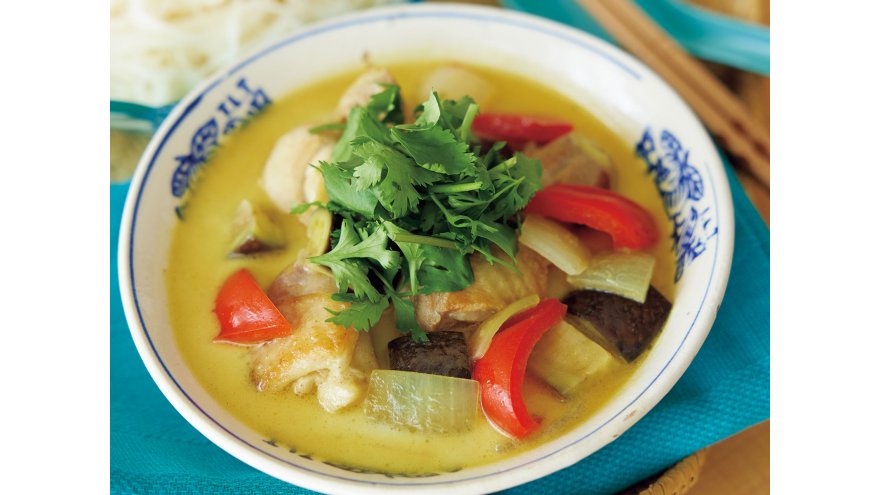 フライパンにサラダ油大さじ1を中火で熱し、鶏肉を皮側を下にして並べ、2分間焼く。肉の上下を返して1の野菜を加え、さらに2~3分間炒める。【A】を加え、煮立ったら弱火で2分間煮る。牛乳を加え、沸騰直前で火を止める。器に盛り、好みでパクチーをのせる。