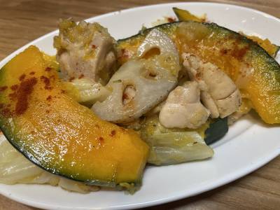 フライパンにオリーブ油大さじ1を弱火で熱し、れんこん、かぼちゃをなるべく重ならないように入れ、ふたをして弱めの中火で2分間ほど焼く。ふたを取って上下を返し、2~3分間焼き、取り出して冷ます。