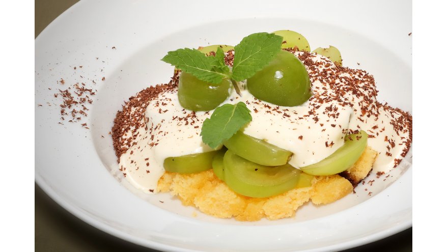 シャインマスカットに、ジン風味のカステラ、豆乳のクリームのカスタードソースを合わせた「大人のスイーツ」。ビターチョコのほろ苦さがアクセントです。