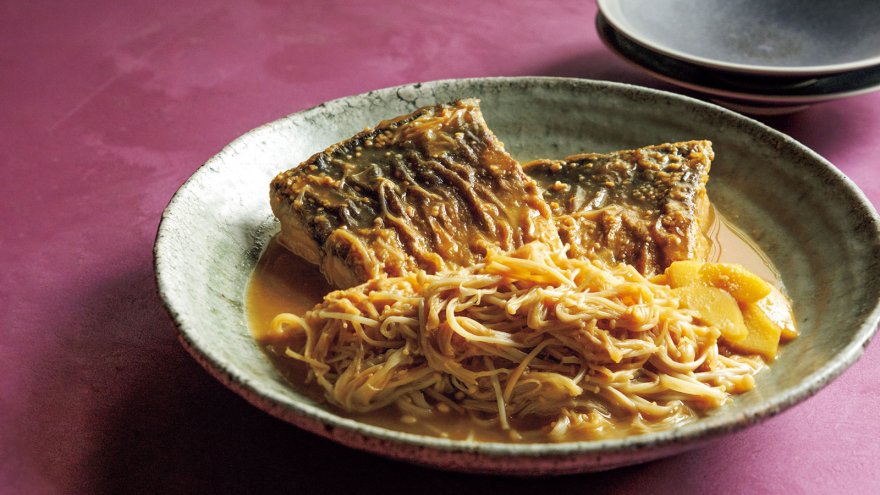 フライパンの余分な脂を拭き取り、【A】を加えてひと煮立ちさせる。1のえのきだけ、しょうがを加え、アルミ箔(はく)をかぶせて弱火で5分間ほど煮る。さばに火が通り、煮汁がトロッとしたら器に盛る。
