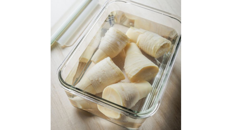 ゆでたけのこは皮をむいた状態で清潔な保存容器に入れ、かぶるくらいの水を加えます。毎日水をかえ、たけのこが水面から出ないようにして冷蔵庫で約5日間保存可能。ただし香りは少しずつ抜けていくので、香りを楽しむなら2日間で使いきるのがおすすめです。