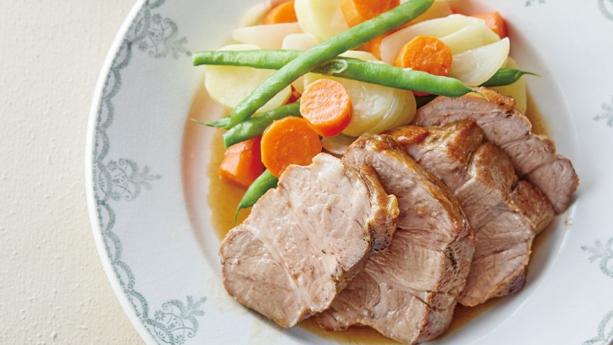 天板にオーブン用の紙を敷き、豚肉を並べる。肉の上に、フライパンに残った油をかけて、ハーブをのせる。100℃のオーブンで1時間焼く。焼き上がったら15分間ほど、庫内で休ませて肉汁を安定させる。オーブンの外で休ませる場合は、アルミ箔はくをかぶせるとよい。