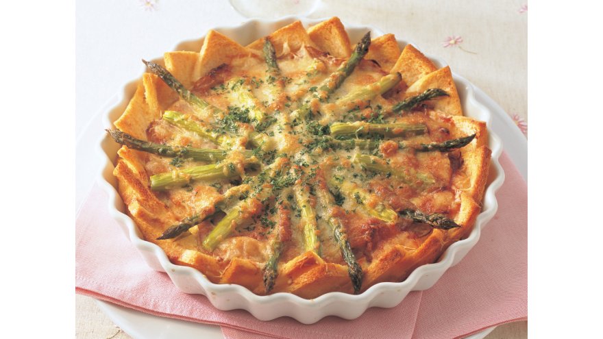 4に2のたまねぎを敷き、アスパラガスとベーコンを放射状に並べる。ナチュラルチーズをふり、5のソースを流し入れる。170℃に温めたオーブンで約40分間、表面がきつね色になるまで焼く。焼き上がったらパセリを散らす。