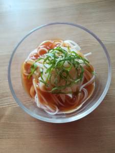 底部を上にして型から抜き、適量切る。ラップフィルムをはずして盛る。
