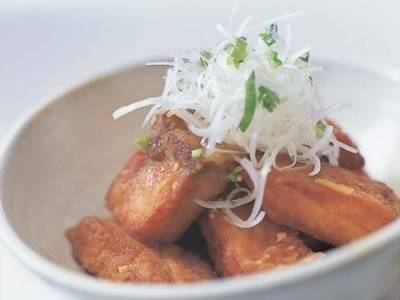 2のさけの汁けをふき、小麦粉を薄くまぶす。170℃の揚げ油でしっかり色づくまで揚げる。