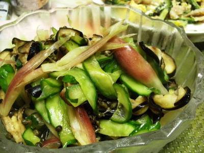みょうがは縦四つ割りにする。なすはヘタを取って縦半分に切り、さらに斜め3mm厚さに切って塩水につけ、アクを取る。きゅうりもなすと同様に切る。しょうがはせん切りにする。