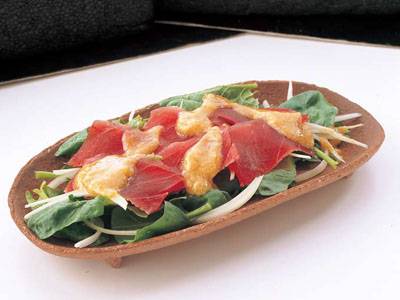 1を器に敷き、まぐろを平らに並べて、3のドレッシングをかける。