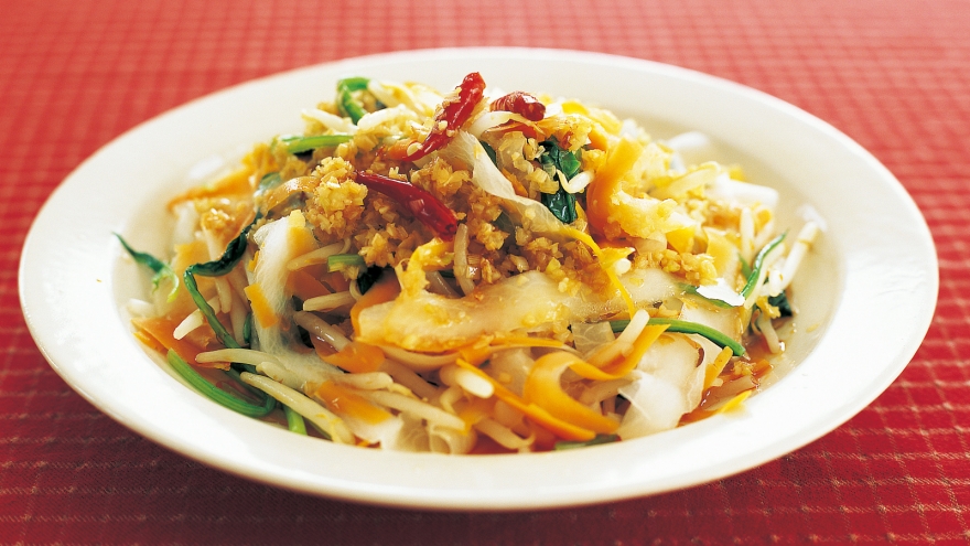 2にアツアツの【ねぎ油】を回しかける。好みで、酢、ラーユをかける。