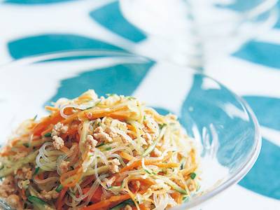 にんじん、きゅうりは4cm長さのせん切りにする。春雨はぬるま湯にしばらくつけて戻し、4cm長さに切って柔らかくゆでる。水にとってさらし、十分に水けをきる。