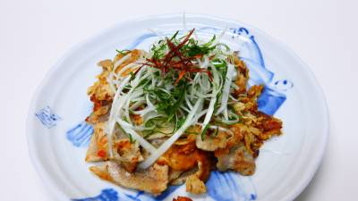 フライパンを温めて2の豚肉を並べ入れ、中火で両面を焼く。器に盛って、4をのせる。あれば糸とうがらしを飾る。白髪ねぎと糸とうがらしを豚肉で包んで食べる。