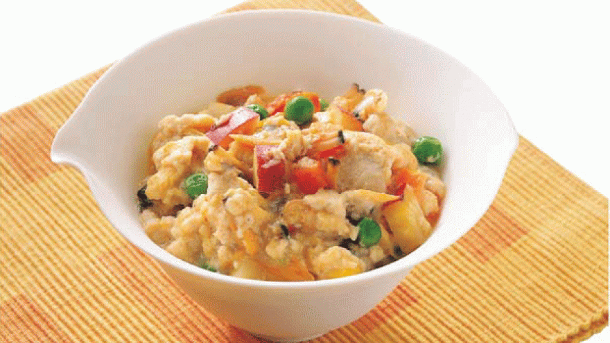 貝やお芋も入った栄養バランスのよい一品。最後に卵でまとめるのでしっとりまろやか。
