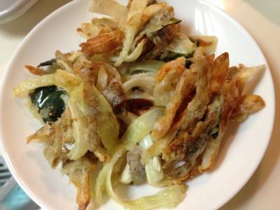 フライパンに揚げ油を1cm深さほど入れて、170℃に温め、3を食べやすい大きさにまとめて、静かに落とす。周りがカリッとなってきたら裏返し、裏面もカリッとするまで揚げる。