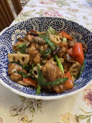 揚げて八分(ぶ)どおり火が通っている。炒めたら、合わせた調味料を加え、一気に仕上げて。