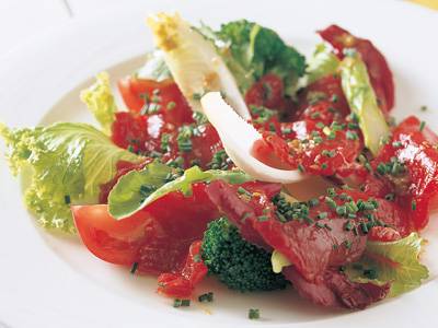 ブロッコリーは小房に分け、ゆでて冷水にとる。グリーンアスパラガスもゆでて冷水にとり、斜めに切る。フルーツトマトはくし形に切る。チコリは縦半分に切る。トレビスは葉を大きくちぎる。