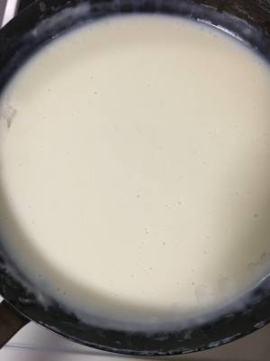 4を再び火にかけ、残りの牛乳を2~3回に分けて加え、かき混ぜながら、フツフツと煮立って、とろみがつくまで中火で煮る。