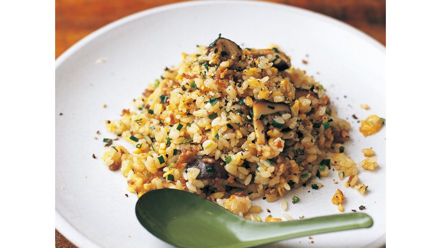 肉の色が変わったら、しいたけを加えて炒める。フライパンの隅に寄せて、あいたところに溶き卵を流し入れ、すかさず卵の上にご飯をのせる。ご飯と卵をよく混ぜ、その後全体をじっくり炒める。