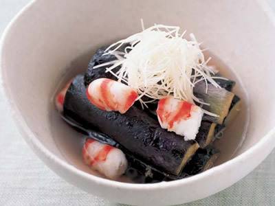えびを戻し入れて火を止め、器に盛る。しょうがはせん切りにし、天盛りにする。