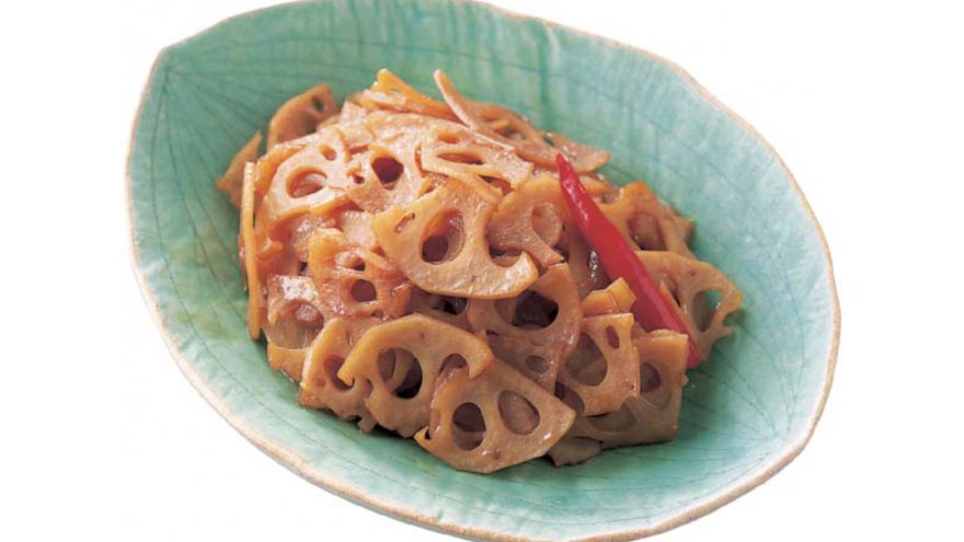 なべを熱してごま油大さじ1をなじませ、れんこんと赤とうがらしを入れて強火で手早くいためる。油が回ったら、1の調味料を加え、混ぜながら煮汁がほぼなくなるまで煮、器に盛る。