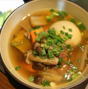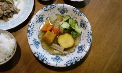 厚手の鍋ににんじん、ごぼう、さつまいもを入れて、水カップ4を注ぎ、火にかける。煮立ったらアクを取って中火にし、野菜スープの素を加えて少し煮る。かぶとかぼちゃも加え、4~5分間煮る。