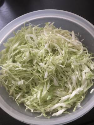 キャベツはせん切りにし、水をはったボウルにつけて洗う。