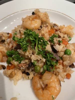 ご飯が炊けたら、いためたえびとバター大さじ1を混ぜ、ふたをして5分間蒸らす。器に盛ってパセリを散らす。