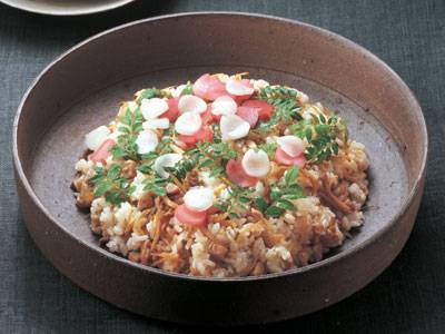 1に4を加えて、よく混ぜて器に盛り、紅白にしたうどと木の芽を散らす。