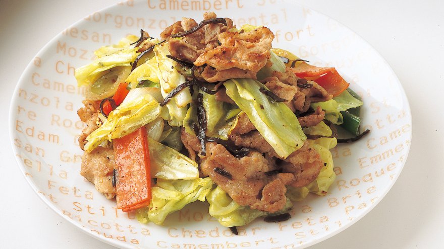 塩昆布を使って、肉野菜炒めにひと味プラス。野菜から出る水けも吸って一石二鳥です。