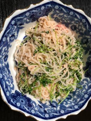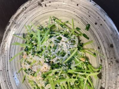 うどは皮をむき、5~6mm角に切り、酢水に放っておく。からすみも、うどと同じ大きさに切る。