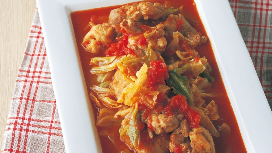 鶏もも肉,キャベツ,トマトの水煮