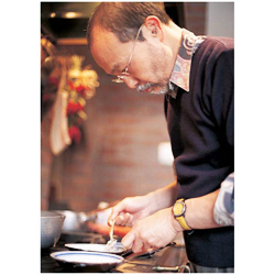 【ソース】をつくる。たまねぎはすりおろし、卵8コは堅ゆでにする。ゆで卵の黄身をほぐし、たまねぎとともにオリーブ油少々で軽くいためて、生クリームを加え、味をみて塩少々を加える。火を止めてから生の卵黄4コ分を割り入れてかき混ぜ、余熱でまとめる(1人分につき、ゆで卵の黄身2コ分、生卵黄1コ分が目安)。