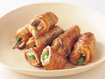冷凍野菜を使ったお手軽肉ロールです。堅めにゆでた冷凍野菜を巻くので、中まで火が通らないという失敗もなし。蒸し焼きにして、しっとり仕上げます。