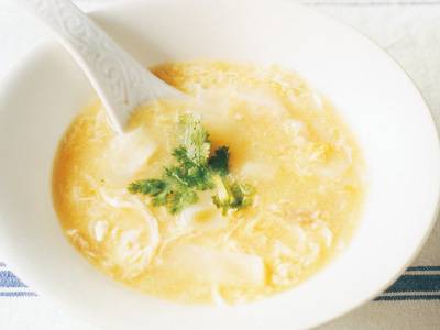 1の溶き卵を細く回し入れて火を止め、香菜を散らす。