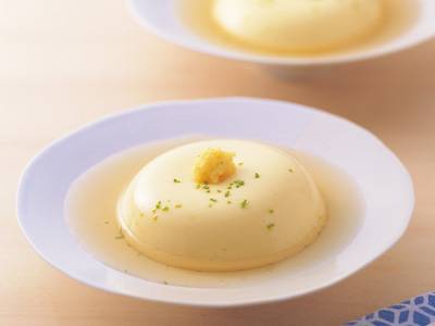 卵豆腐の縁に竹ぐしを差し入れて1周させ、くずれないように手で押さえながら茶碗から抜き出す。皿に盛り、夏だし(だしを極めたそうめん参照)を適量をかけ、しょうがをのせて、青ゆずの皮をふる。