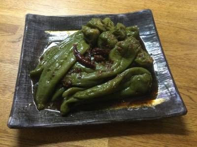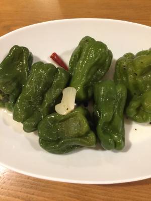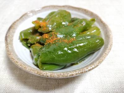 にんにくと赤とうがらしがきいたピーマンの蒸し煮。温かいままでも、冷やしてもおいしくいただけます。
