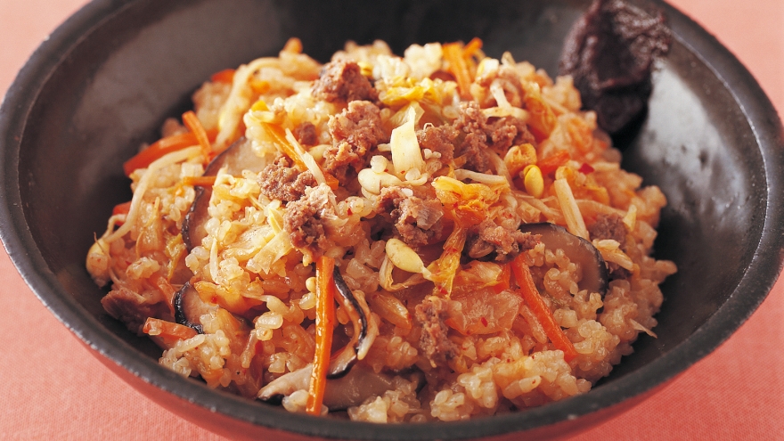 つくって冷凍しておけば、食べるときは電子レンジで温めるだけのビビンバ丼。たっぷりの野菜と肉が食べられるコクのある味つけです。