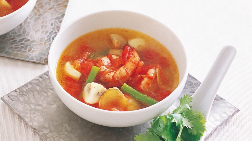 鍋にサラダ油大さじ2を熱し、香菜の根を香りがよくなるまでじっくり炒める。香りがたったらえび(うまみが逃げないように殻付きのまま)、赤とうがらし、しょうがを入れて炒める。えびの色が変わったらマッシュルーム、にんにくの芽、トマトの順に加えて炒める。油が回ったら湯カップ4、スープのもとを加え、煮立ったらアクをすくって中火で3分間煮る。