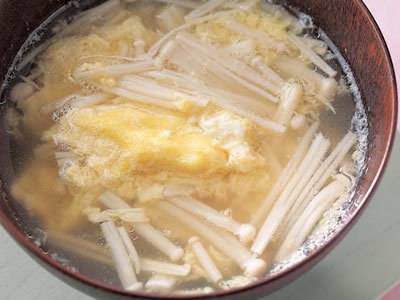1にえのきだけを加え、卵をなべに細く流し入れる。ふわっと沸き上がったら火を止め、椀によそい、好みで一味とうがらしをふる。