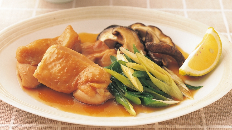 鶏肉は厚みを半分にし、5cm角に切って皿に並べ、うまみじょうゆをかける。しいたけは石づきを除き、1cm幅のそぎ切りにする。わけぎは5mm幅の長めの斜め切りにする。