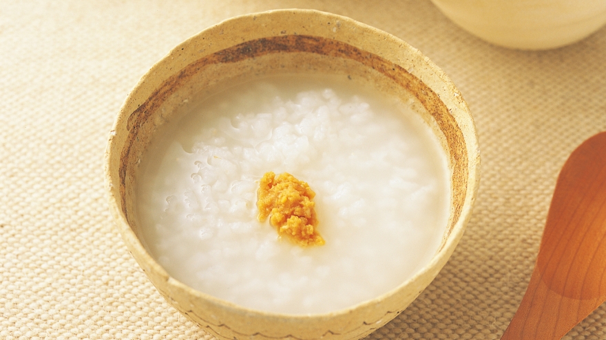 栄養たっぷり、まろやかなコクのみそ卵をおかゆにのせると、とろけるおいしさです。