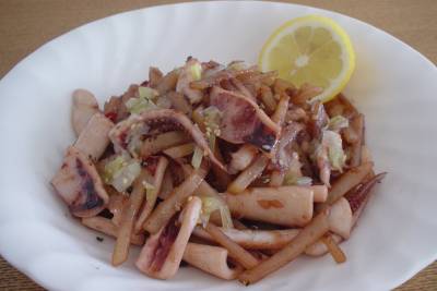 いかは胴の部分に料理ばさみで縦に切り目を入れて開き、足を持って内臓をはがすように取り、胴からはずす。続いて軟骨を取り除く。足は目の下あたりで内臓を切り落とし、クチバシを取る。胴と足を流水でよく洗って水けをきり、胴は3~4cm角に切る。足は手でしごいて吸盤を取り、2本ずつに分ける。