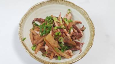 いかの色が変わったら、しょうゆ少々を加えて全体にからめ、器に盛る。残りのねぎ塩だれを回しかけて細ねぎと黒こしょう適量をふり、レモンを添える。