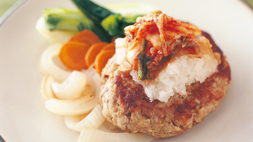 肉と野菜に火が通ったら器に盛り、大根おろしとキムチをのせ、ポン酢しょうゆをかける。