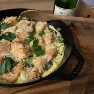 ようじを抜いて、食べやすく切って器に盛る。スライスチーズを切って上にのせ、煮汁をかける。