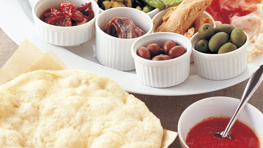 バジルの葉、半熟卵、モッツァレラチーズ、ドライトマト、なす、甘長とうがらし、アンチョビ、ツナ、オリーブ(黒・緑)、ケイパーベリー、生ハム、サラミなど、好みの食材でOK!トマトソース(鍋でひと煮立ちさせる)も添えて。