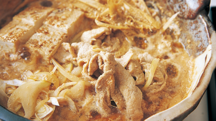 こっくりやさしい豆乳みそベースの割り下に、豚肉がぴったり。味がしみたごぼうや豆腐もおいしい。