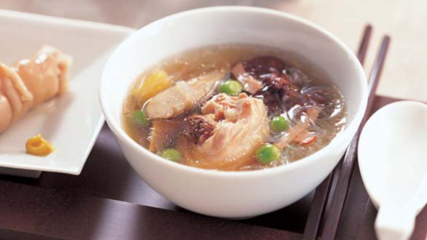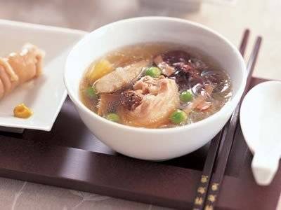 大きめの耐熱性容器に1を入れ、軸を取った干ししいたけ、適当に切った春雨、24を加える。塩小さじ1、紹興酒も加えて水カップ5を注ぐ。