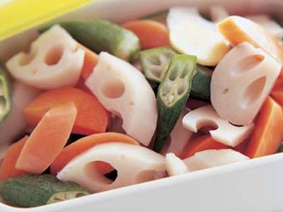 なべに水・酢各カップ1、砂糖大さじ3、薄口しょうゆ大さじ2、しょうが、ごま油小さじ1を煮立て、1を加えて上下を返しながら2分間煮る。ボウルにあけて荒熱をとり、オクラとともに密閉容器に入れ、冷蔵庫で味をなじませる。