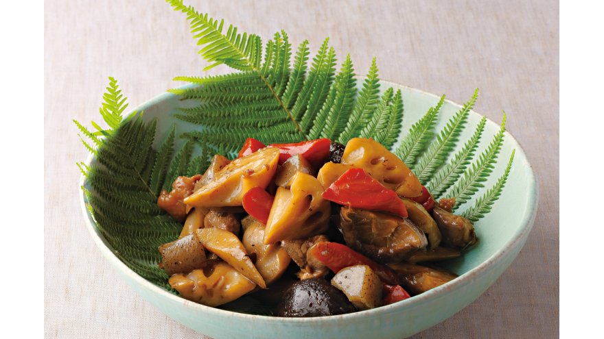 鍋にサラダ油大さじ2を足して熱し、れんこん、ごぼう、こんにゃくを炒める。なじんだら、にんじんとしいたけを加え、鶏肉を戻し入れてさらに炒める。