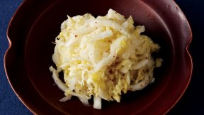 ピリ辛サラミとかきのフライに、キャラウェイとレモンで風味をつけたキャベツを添えます。さっぱりと、香りよくいただけます。