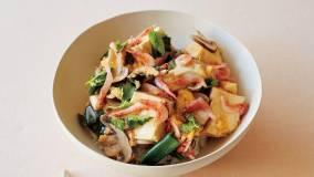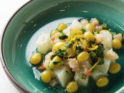 蒸したえびと野菜を、松の実を加えたヤンニョム(薬念)であえた、代表的な宮廷料理です。